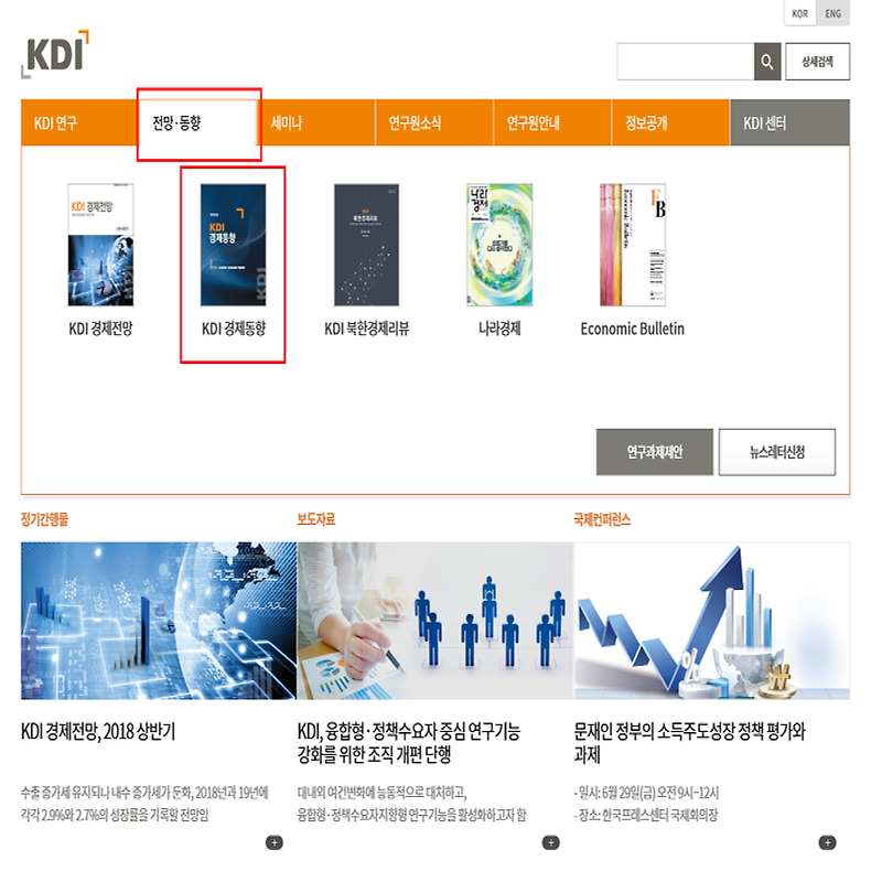 경제동향보고서 뿐만 아니라 KDI 경제전망, KDI 북한경제리뷰, 나라경제는 물론 각종 견구자료와 연구보고서 등을 확인할 수 있는 곳입니다.