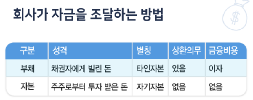 부채 = '빚'으로 향후 기업의 자원유출이 예상되는 의무(회사채 , 차입금 , 상품을 제조하기 위해 부품을 미리 구입했으나 아직 기지급하지 않은 상태의 미지급금 , 1년이내 유출이 예상되는 부채는 유동부채 , 1년 이후에 유출이 예상되는경우 비유동부채로 분류)