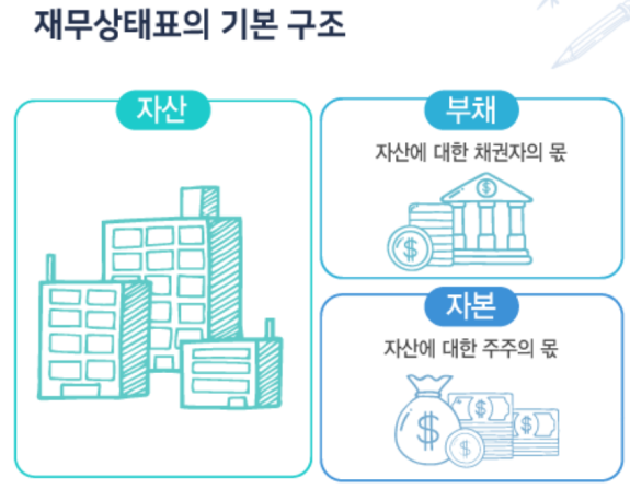 재무상태표의 구성 (대차대조표라고 불렸으나 국제 회계기준에 의해 개명)자산 = 자본 + 부채자본 =자산 - 부채부채 = 자산 - 자본